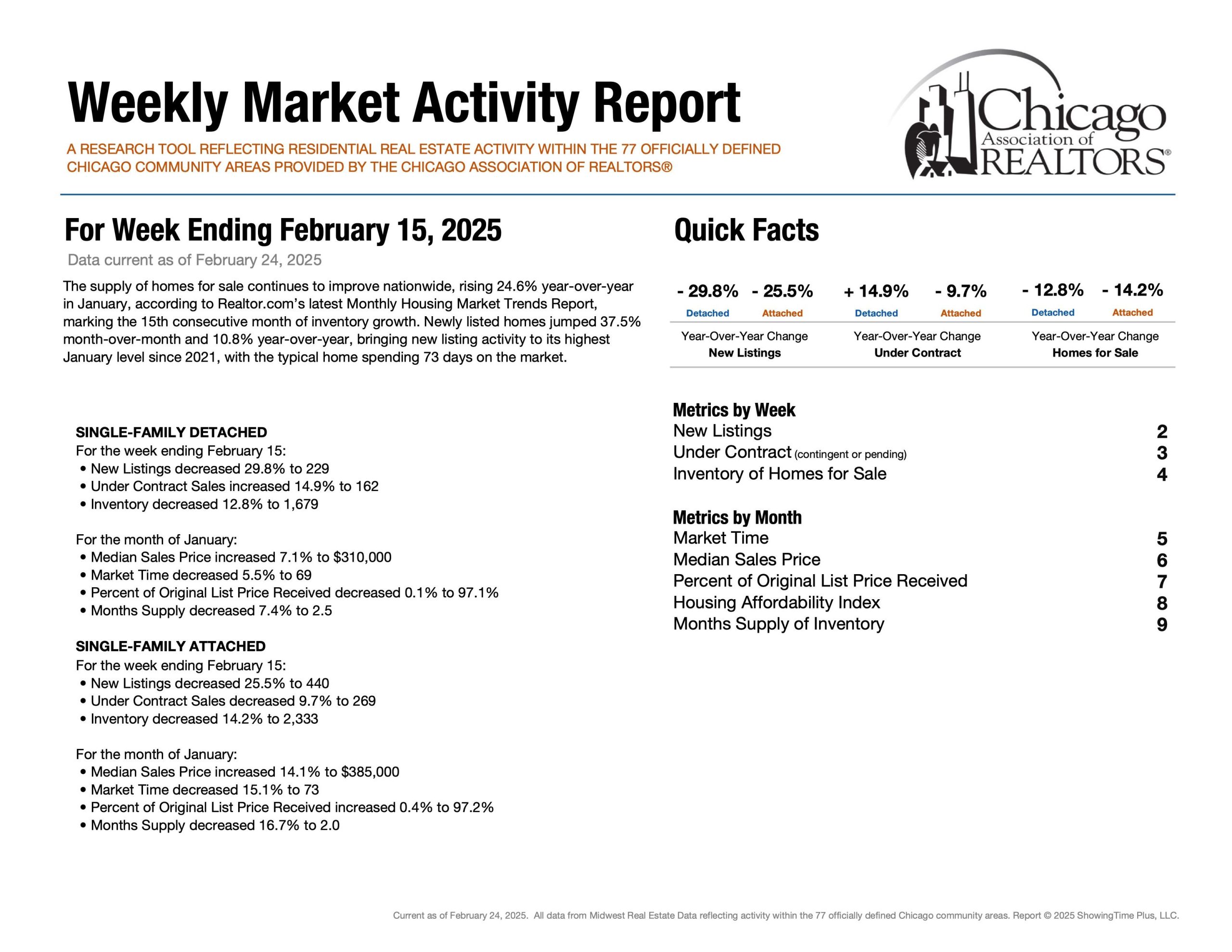 Please note all of these metrics are along a spectrum as opposed to a specific number. Below is “The Weekly Market Activity Report” which is a research tool reflecting residential real estate activity within the 77 officially defined Chicago community areas provided by the Chicago Association of Realtors®. It is essential to keep in mind that real estate markets can vary across neighborhoods and property types within a city. In conclusion, economic conditions and external factors can influence market trends. Staying updated on these metrics and trends is crucial for making informed decisions.